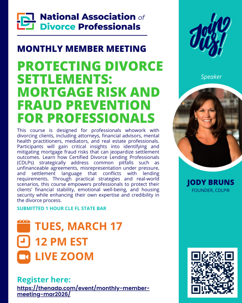 Divorce settlements often bring unique challenges where legal, financial, and emotional dynamics intersect. This course is designed for professionals who work with divorcing clients, including attorneys, financial advisors, mental health practitioners, mediators, and real estate professionals. Participants will gain critical insights into identifying and mitigating mortgage fraud risks that can jeopardize settlement outcomes. Learn how Certified Divorce Lending Professionals (CDLPs) strategically address common pitfalls such as unfinanceable agreements, misrepresentation under pressure, and settlement language that conflicts with lending requirements. Through practical strategies and real-world scenarios, this course empowers professionals to protect their clients’ financial stability, emotional well-being, and housing security while enhancing their own expertise and credibility in the divorce process.