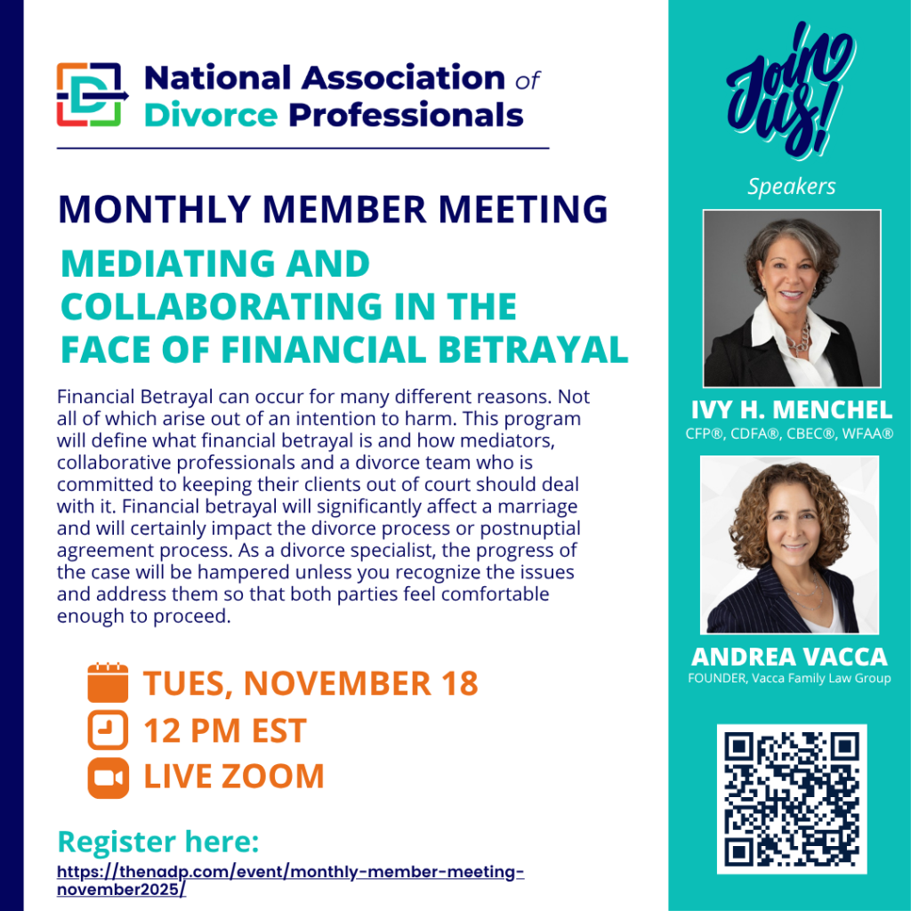 Financial Betrayal can occur for many different reasons. Not all of which arise out of an intention to harm. This program will define what financial betrayal is and how mediators, collaborative professionals and a divorce team who is committed to keeping their clients out of court should deal with it. Financial betrayal will significantly affect a marriage and will certainly impact the divorce process or postnuptial agreement process. As a divorce specialist, the progress of the case will be hampered unless you recognize the issues and address them so that both parties feel comfortable enough to proceed.