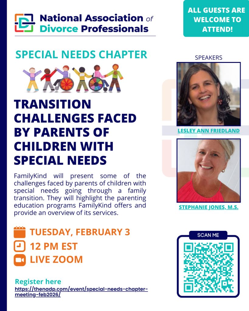 FamilyKind’s services support families, especially those navigating the often turbulent times around parental separation and divorce. Lesley Friedland and Stephanie Jones will present some of the challenges faced by parents of children with special needs going through a family transition. They will highlight the parenting education programs FamilyKind offers and provide an overview of FamilyKind’s services.